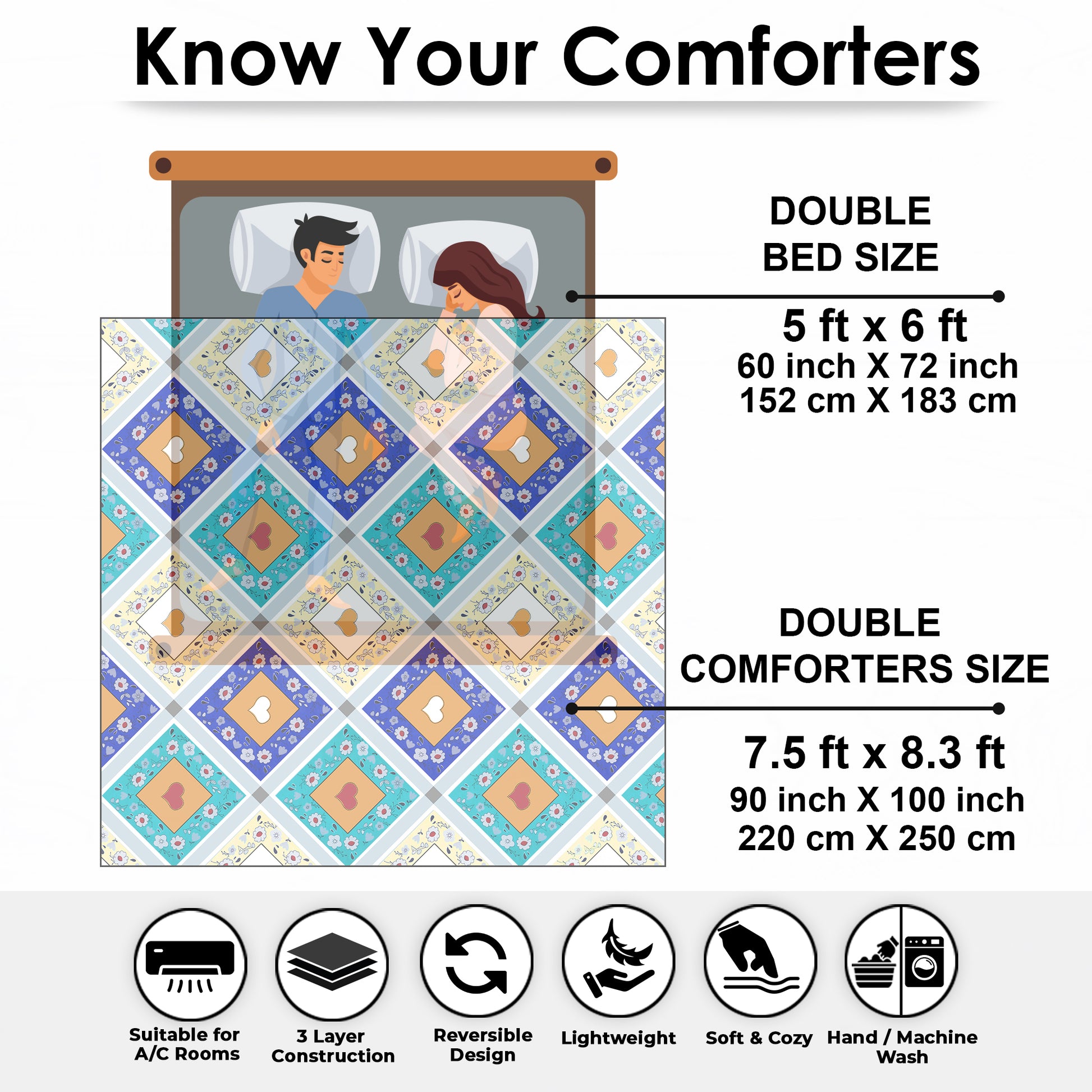 A: Our comforters are available in multiple sizes, 220 cm X 250 cm (Double Size Comforter) and 150 cm X 225 cm (Single Size Comforter) to suit various bedding dimensions.