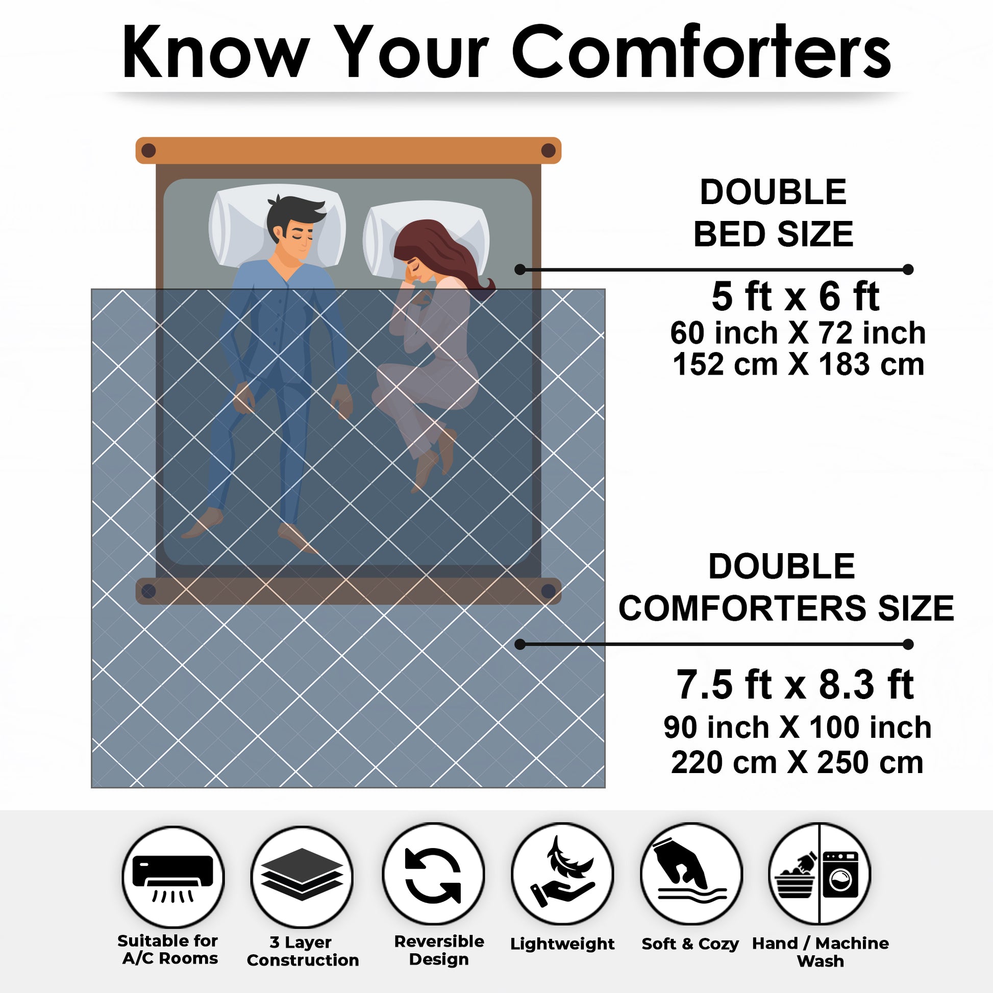 A: Our comforters are available in multiple sizes, 220 cm X 250 cm (Double Size Comforter) and 150 cm X 225 cm (Single Size Comforter) to suit various bedding dimensions.
