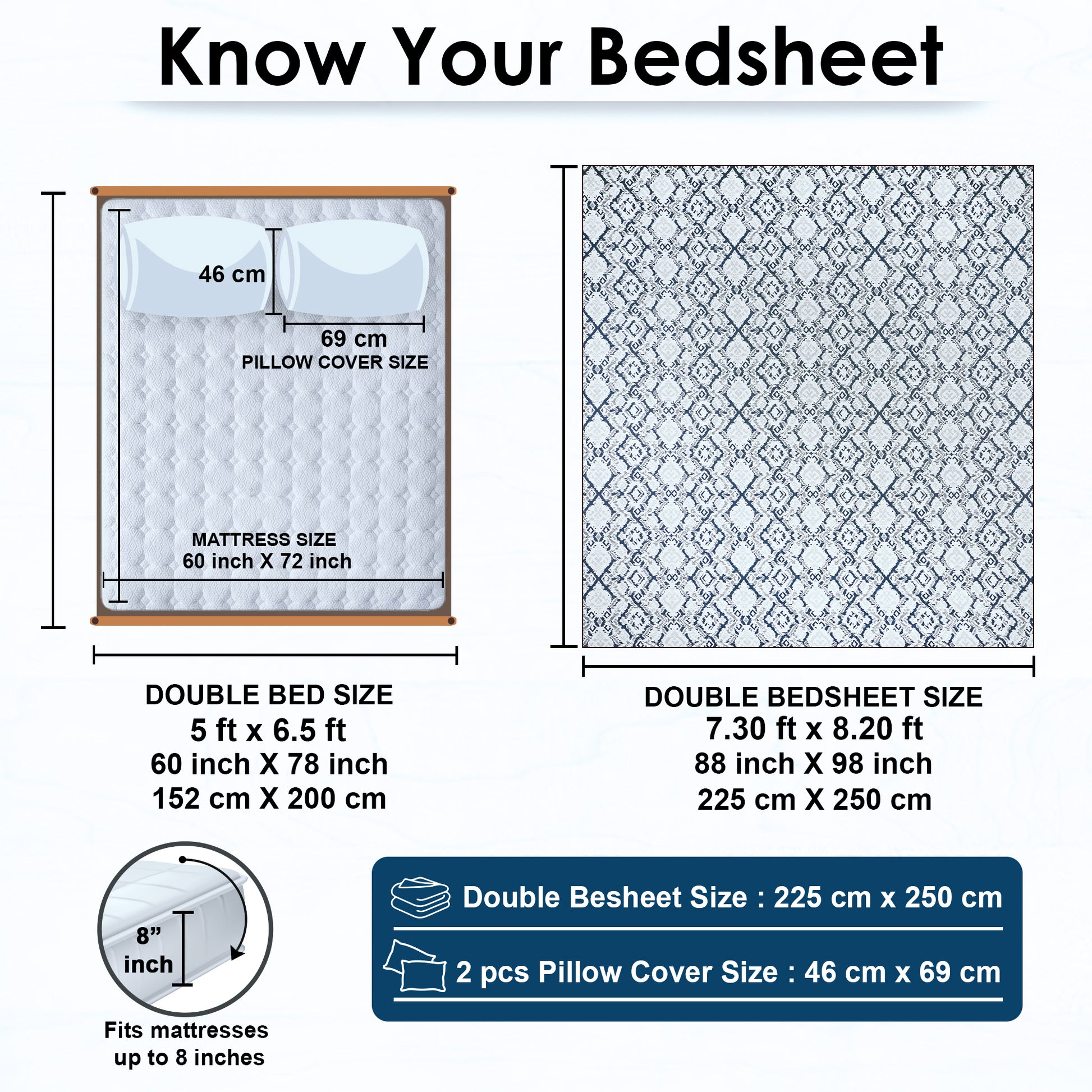 Double Bedsheet : 225 X 250 cm | Pillow Cover : 46 X 69 cm |