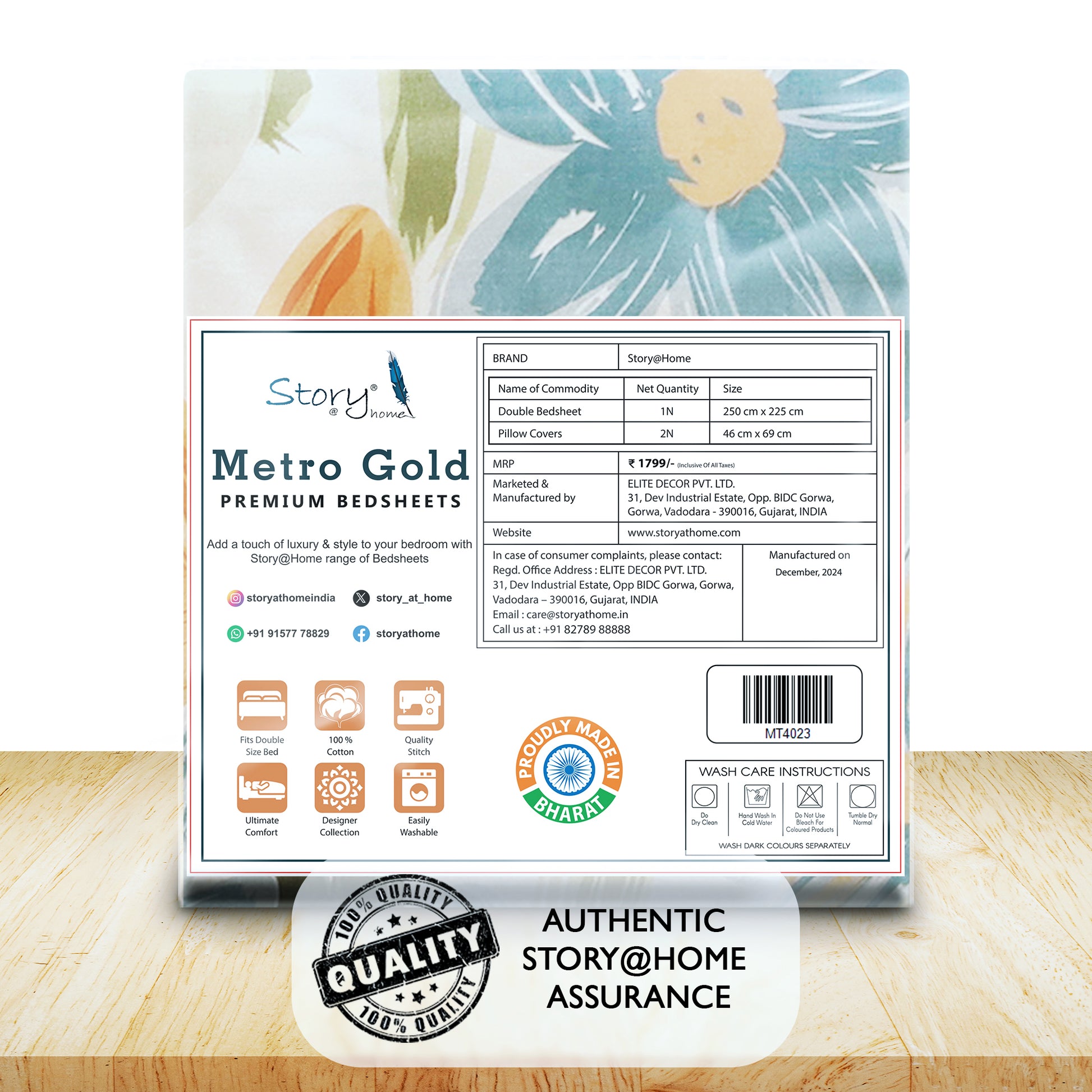 Metro Gold 190 TC Cotton White & Light Blue Double Bedsheet with Pillow Covers