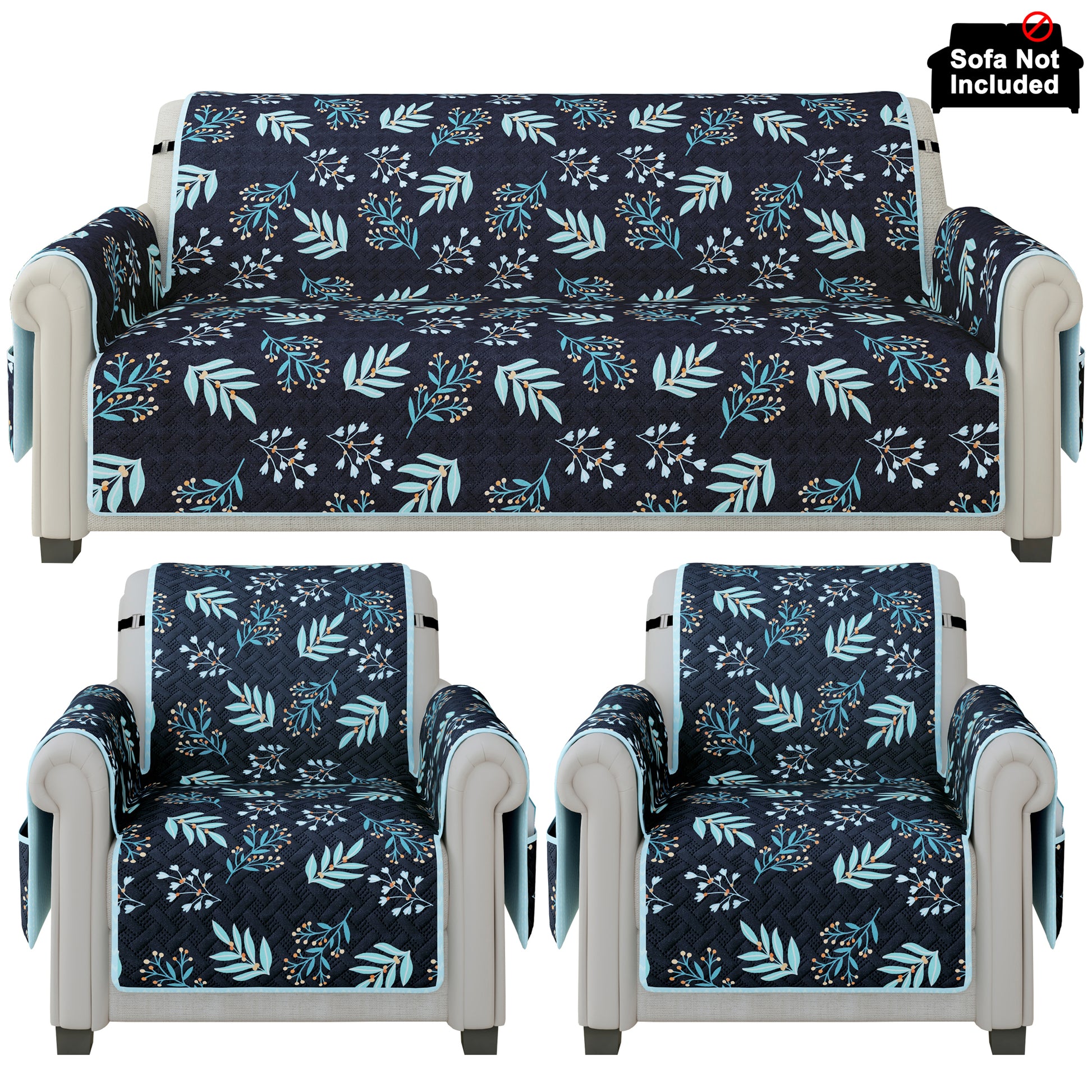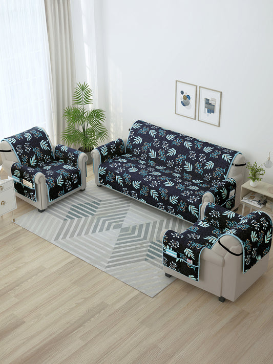 Sofa Throw Cover Combo – 2 Pcs 1 Seater and 1 Pc 3 Seater Navy Blue & Sky Blue Floral & Chevron Pattern with Pocket by Story@Home