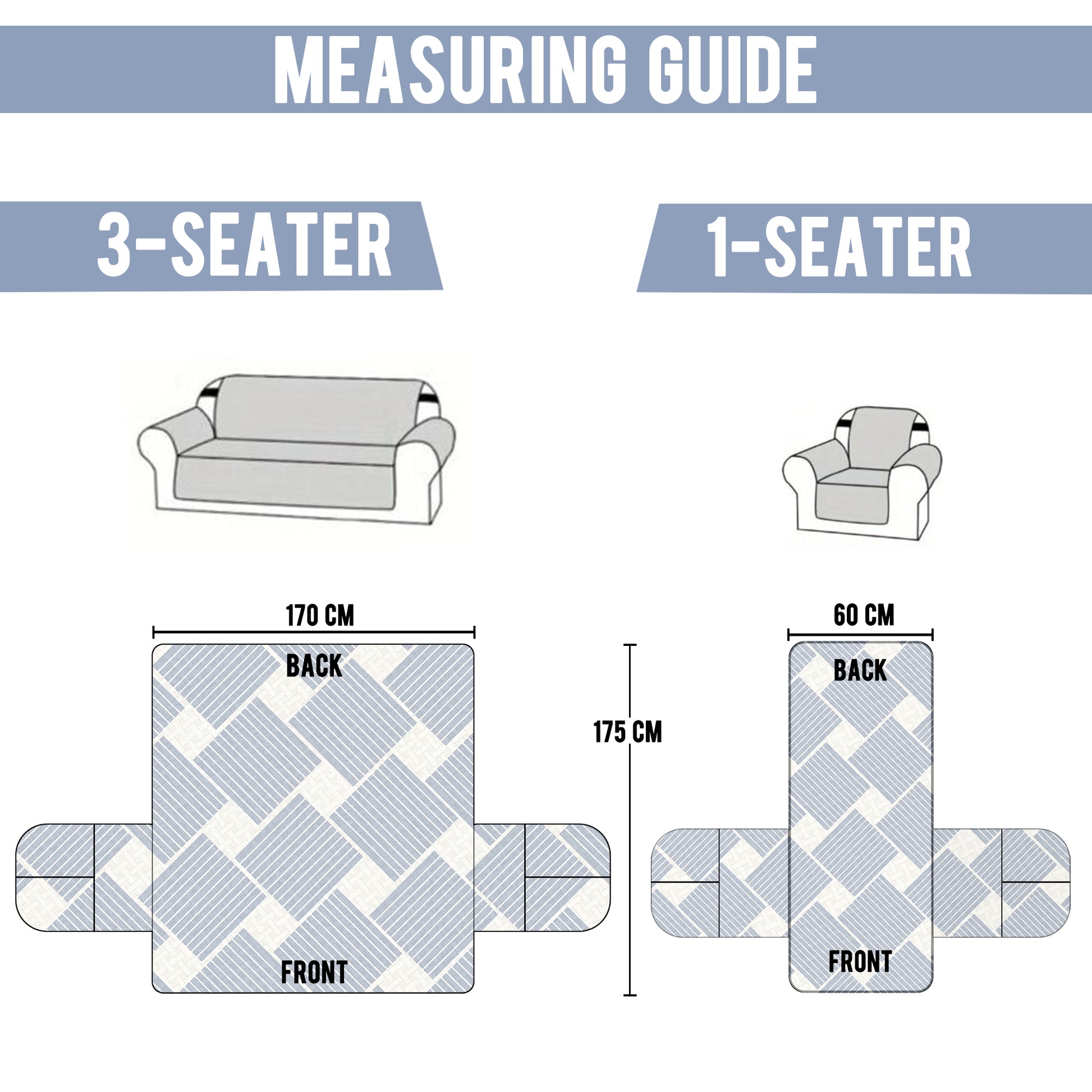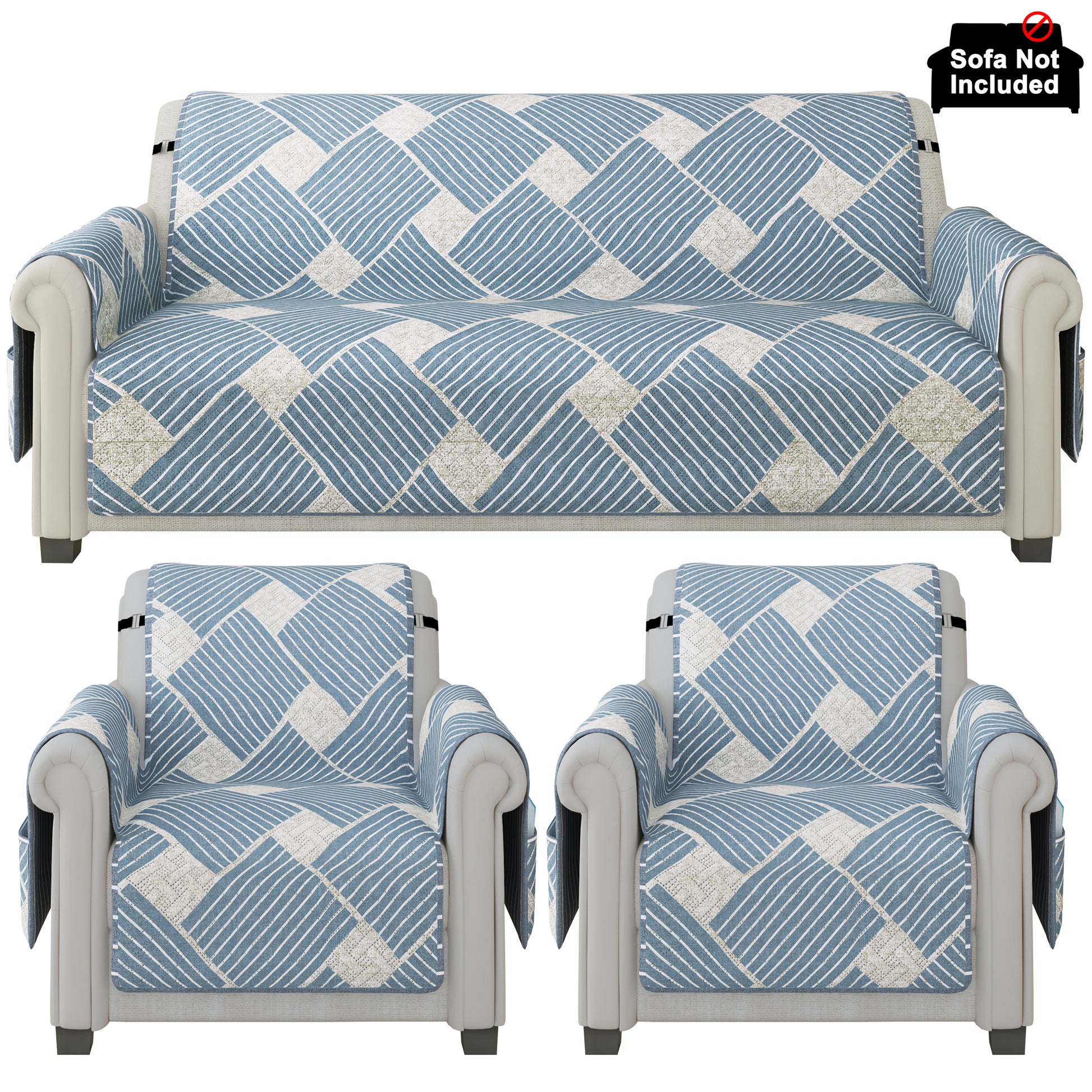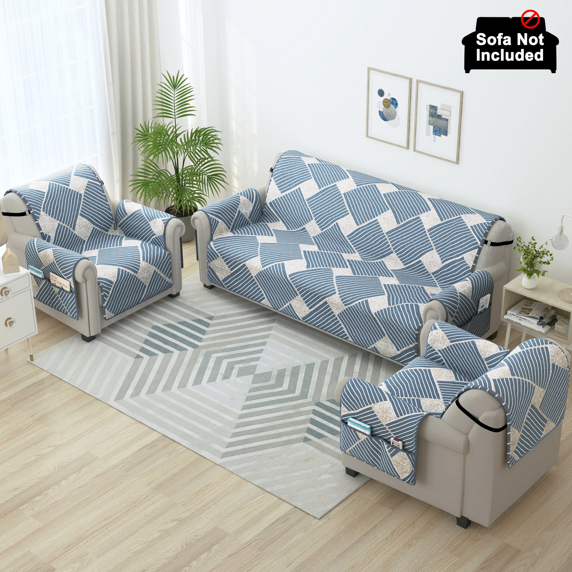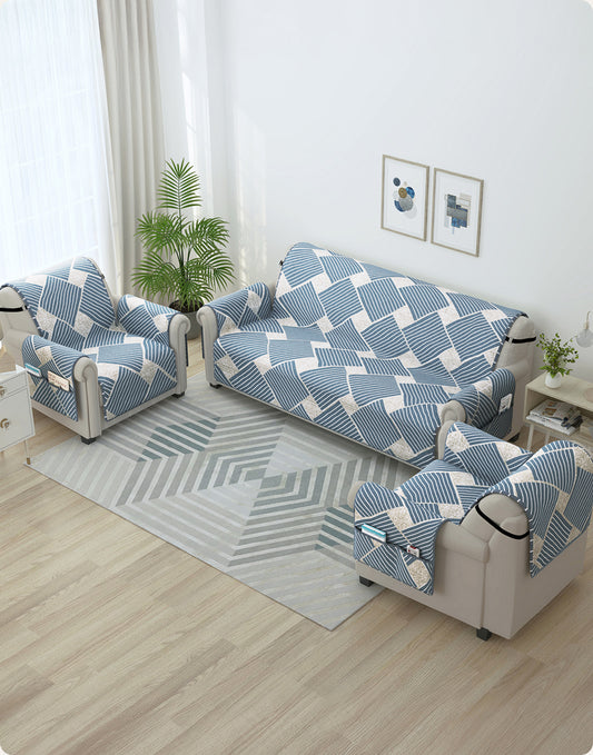 Sofa Throw Cover Combo – 2 Pcs 1 Seater and 1 Pc 3 Seater Greyish Blue Geometric & Stripes Pattern with Pocket by Story@Home