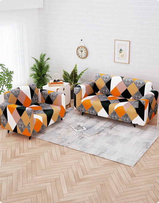 Sofa Cover Combo – 1 Pc 2 Seater and 1 Pc 3 Seater Elastic Stretchable in Orange & Beige Abstract Pattern by Story@Home