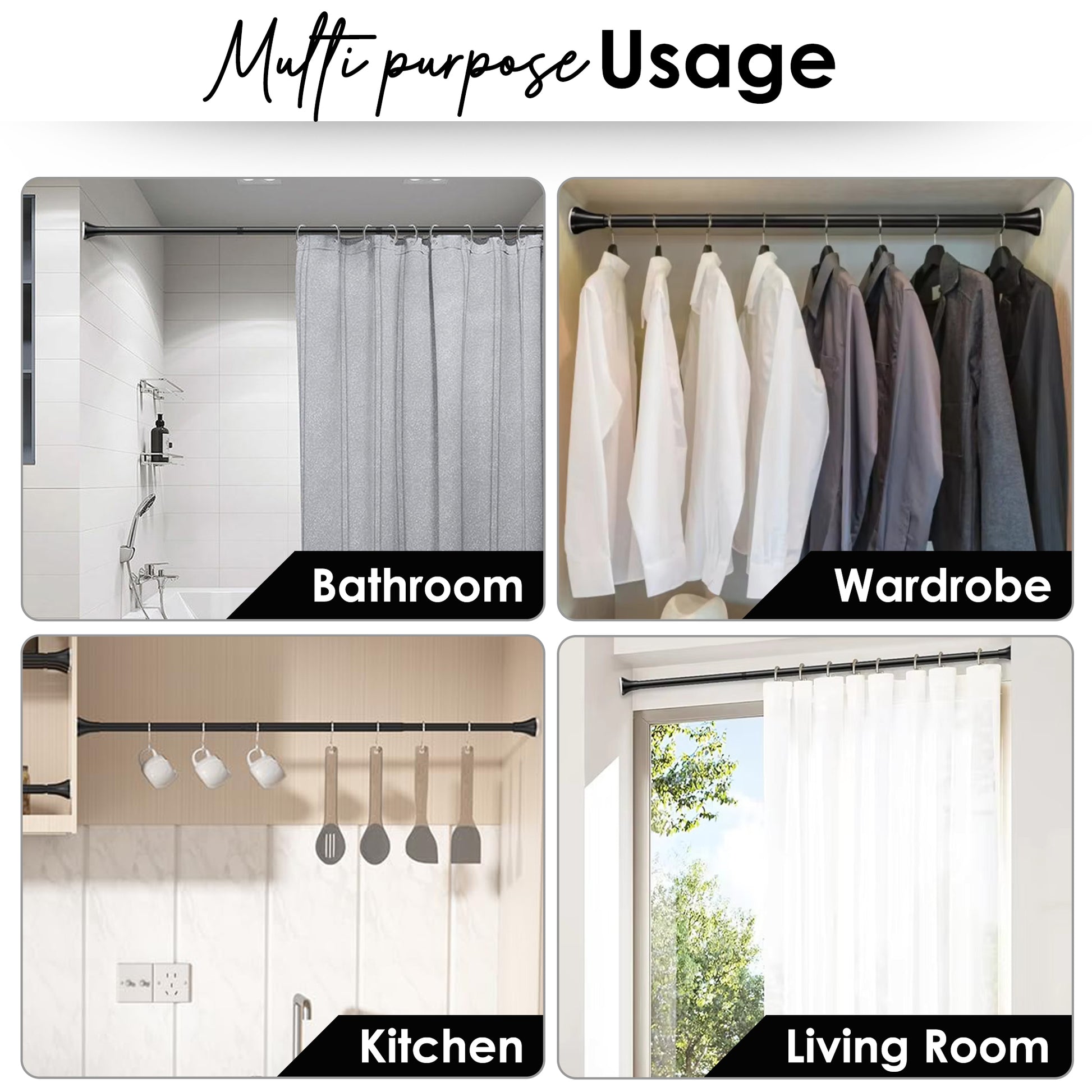 - Adjustable-length shower curtain rod for easily hanging a shower curtain, no carpenter, no drill, no screws, no damages just easy installation. No damage to the walls or tiles