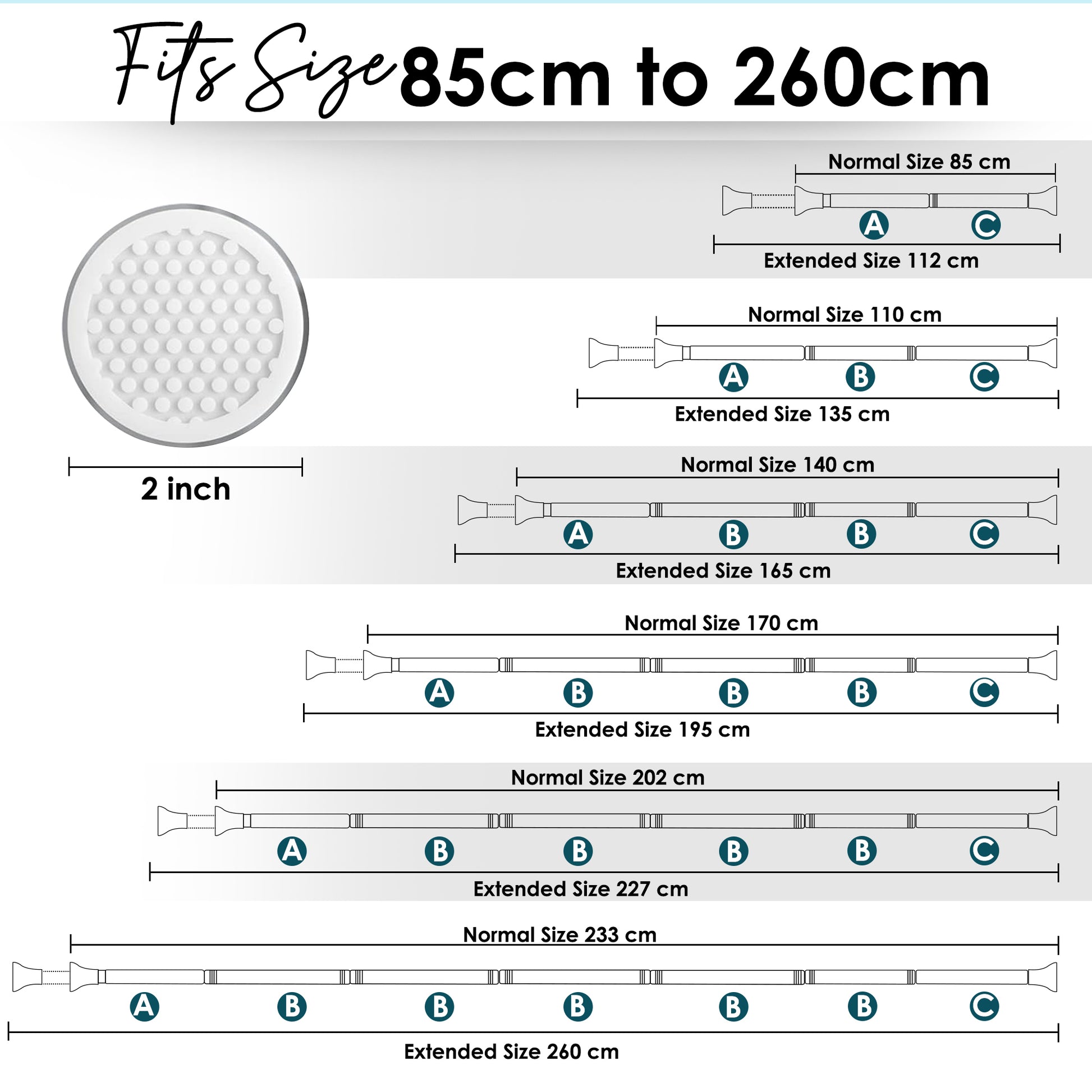 - Shower curtain rod-M measures 85 CM (33 inches) but can extend up to 165 CM (65 inches) and Curtains rod -X measures 85 CM (33 inches) but can extend up to 260 CM (102 Inches) making it versatile for various bathroom sizes. Ideal for fitting different shower spaces with ease