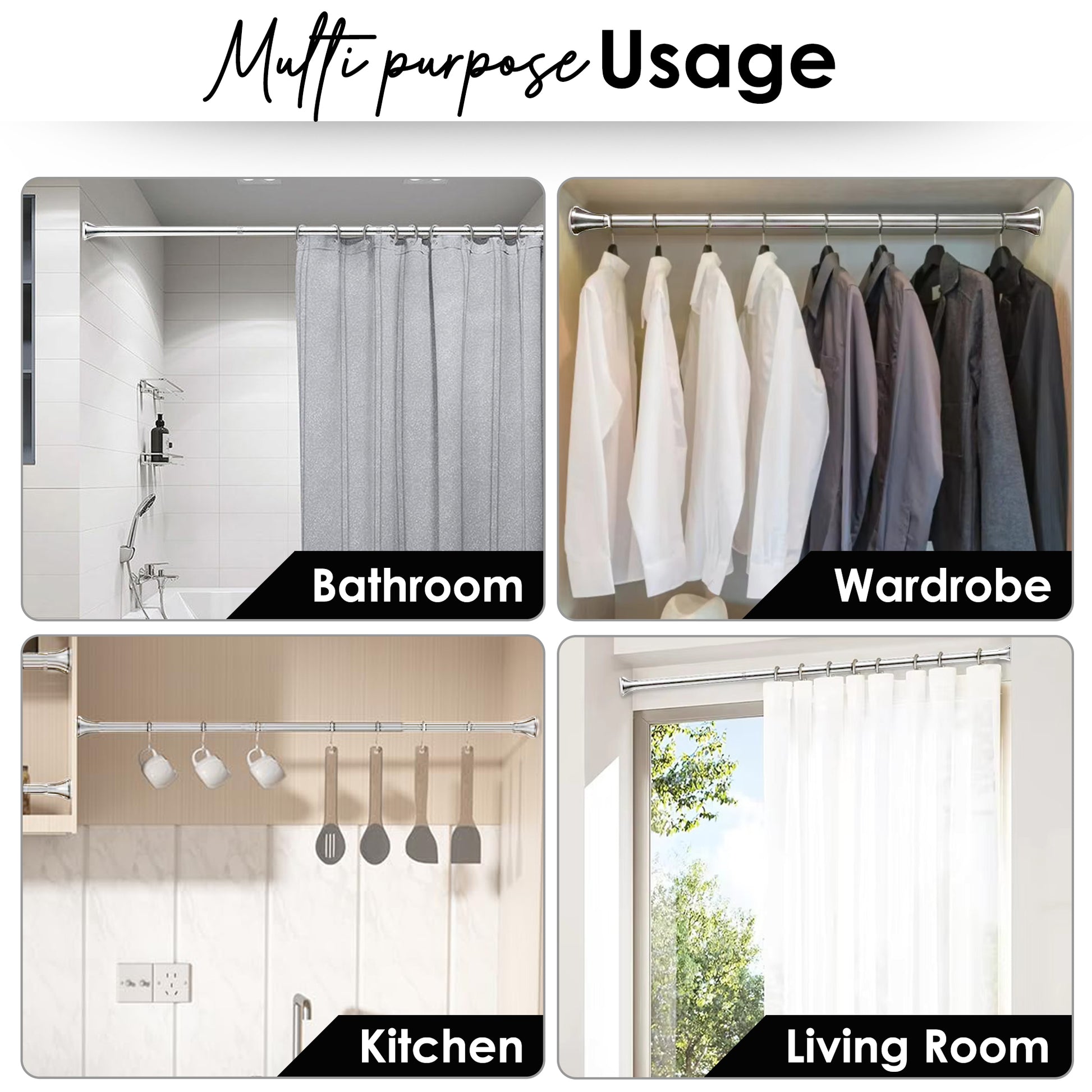 - Adjustable-length shower curtain rod for easily hanging a shower curtain, no carpenter, no drill, no screws, no damages just easy installation. No damage to the walls or tiles