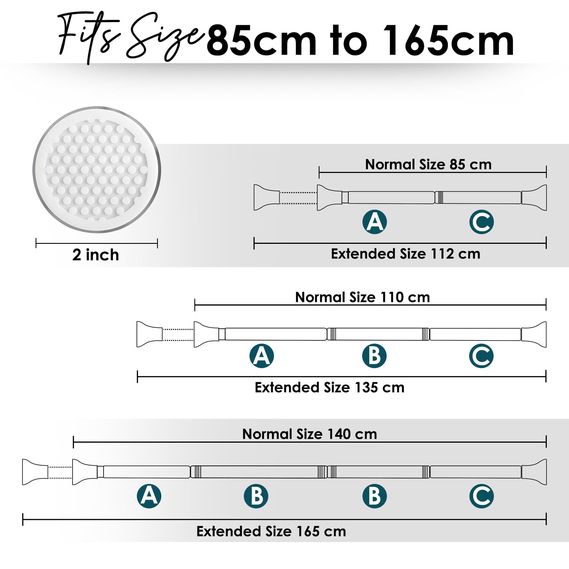- Shower curtain rod-M measures 85 CM (33 inches) but can extend up to 165 CM (65 inches) and Curtains rod -X measures 85 CM (33 inches) but can extend up to 260 CM (102 Inches) making it versatile for various bathroom sizes. Ideal for fitting different shower spaces with ease