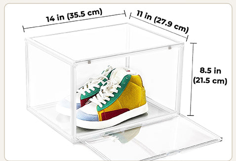 A: Each box measures 27.94L x 35.56W x 21.59H cm, designed to comfortably fit most sneaker sizes, including high-tops and basketball shoes.